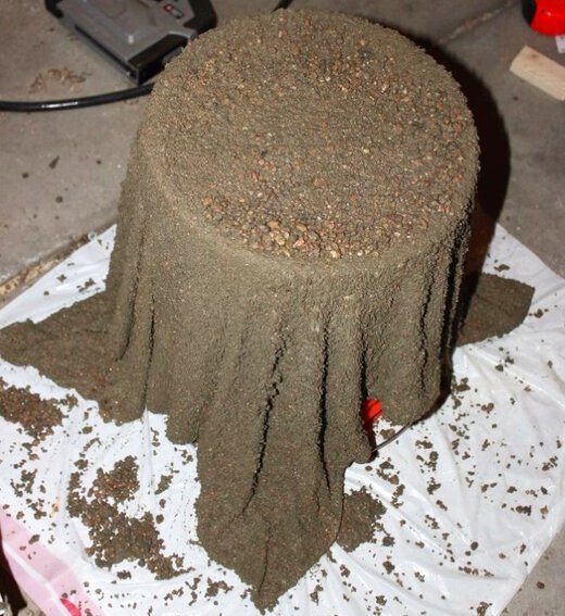 Теперь осталось набраться терпения, чтобы смесь схватилась и набрала прочности. После вытаскиваем ведро из этой оригинальной формы и вуаля. Также можно уже готовый вазон залить смесью внутрь, то есть на донышко внутрь, что сделает его более устойчивым, крепким. Кроме того обработка изнутри смолой, лаком способна будет защитить стенки от проникновения влаги при поливе и быстрого разрушения конструкции. Сверху вполне можно покрасить, но краска держаться будет так себе… проще красить не эмалью, а колером, придавая смеси определенный цвет на первоначальном этапе.