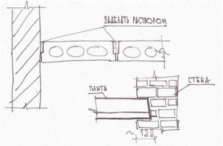 Прежде всего, до проведения монтажных работ необходимо подготовить плиту к укладке. Подготовка плиты заключается в проверке ее геометрических размеров. Плита должна быть правильной геометрической формы, без значительных выступов и сколов. Если на плите имеются подобные отклонения, то их необходимо устранить до проведения монтажа. Также перед монтажом лучше всего заделать торцы плит перекрытия, вернее заделать пустоты в них. Пустоты можно заложить обыкновенными обломками кирпича и зацементировать с помощью цемента. Еще лучше предварительно утеплить пустоты современным шумо- и теплоизоляционным материалом, на глубинно 300-400 мм. В этом случае плиты будут лучше защищены от проникновения в них холодного воздуха, а соответственно и теплоизоляция вашего сооружения будет лучше. Особенно актуально это при монтаже чердачных перекрытий, когда стена не закрывает торцы плиты. Также заделка из кирпича значительно усилит края плиты, что актуально в случае когда плита опирается на внутреннюю плиту а на ней стоит стена идущая выше.
