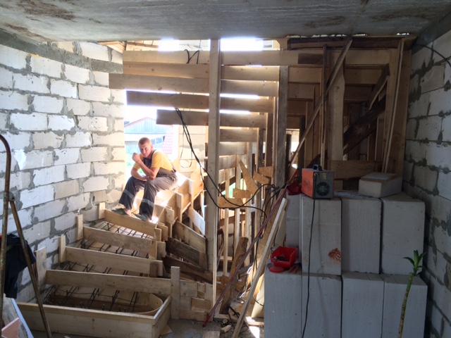 Сейчас можно и залить бетон. Заливать бетон лучше одним объемом, то есть всю лестницу разом. Это обеспечит ее целостность, прочность, а значит и безотказность во время эксплуатации.