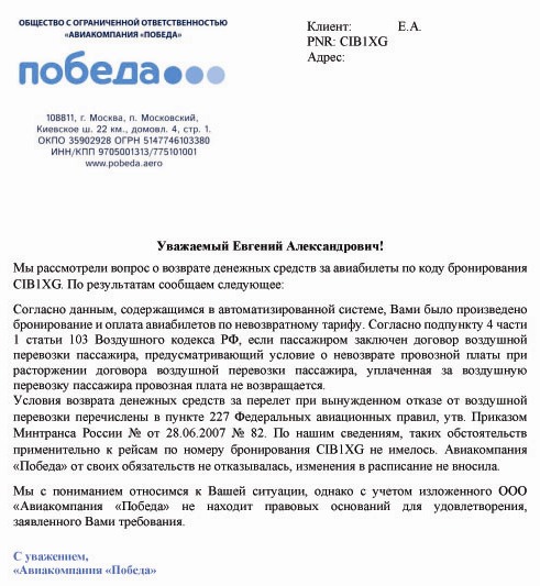 Моя история, опыт по возврату невозвратных билетов компании "Победа"